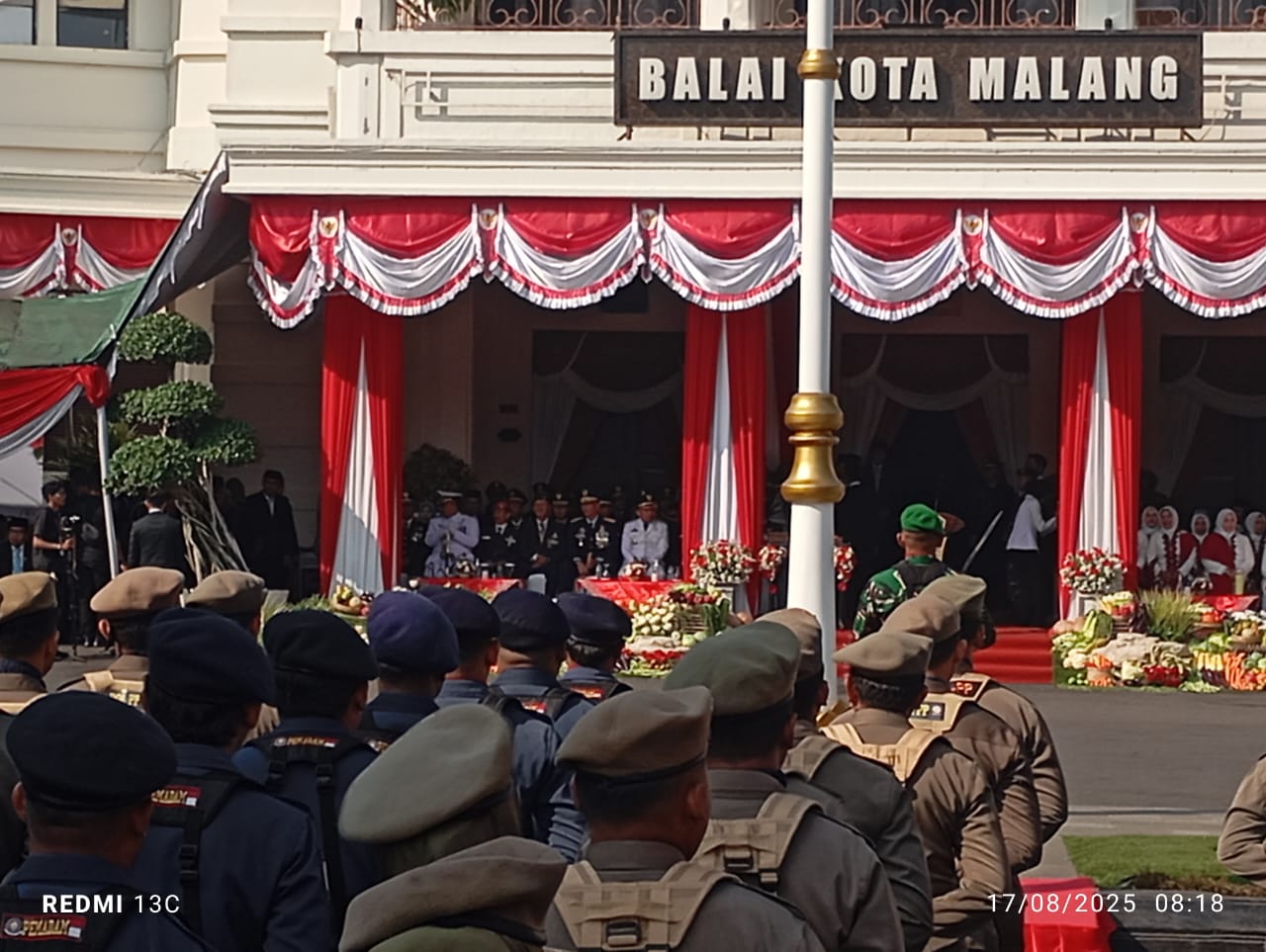 “Acara ini peringatan 80 tahun kemerdekaan yang hari ini kita rayakan. Ini juga menjadi satu arti yang harus kita hayati, karena perjuangan dari pahlawan kita luar biasa,” seru Wahyu, usai upacara peringatan HUT ke-80 RI di Balai Kota Malang, Minggu (17/8/2025).